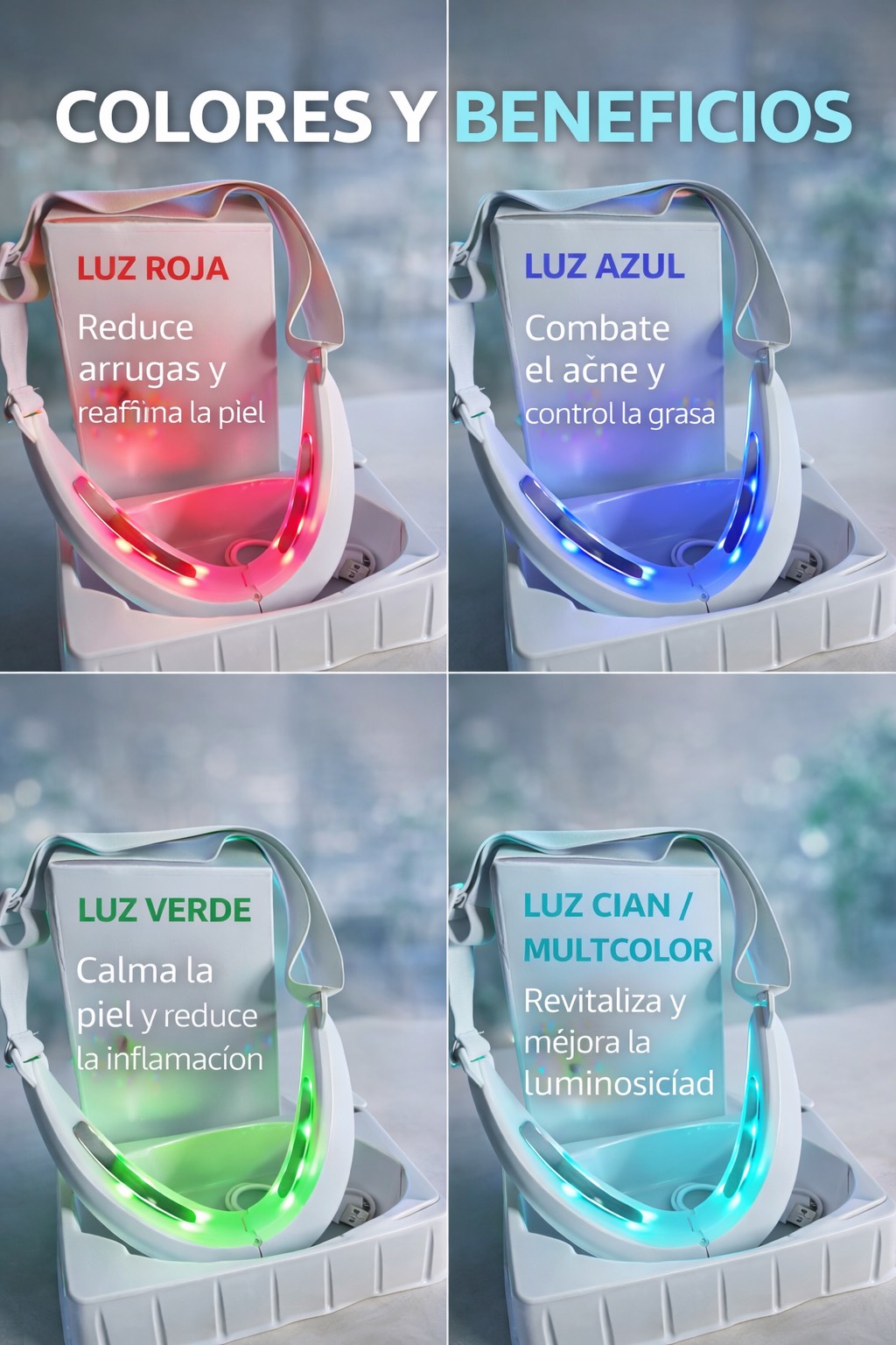 Luz Cian / Multicolor: Revitaliza la piel, mejora la luminosidad y aporta un aspecto más fresco y saludable.